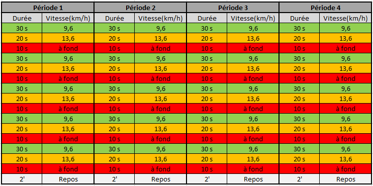 Les périodes de 5 minutes de course sont constituées de 5 intervalles consécutifs de une minute sous la forme 30, 20 et 10 s de course.